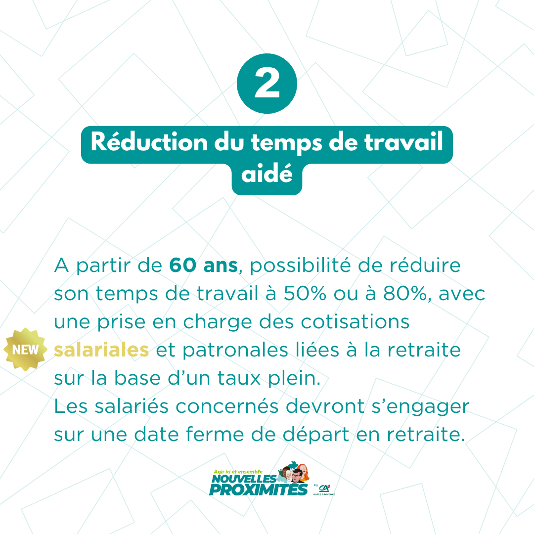 → A partir de 60 ans, possibilité de réduire son temps de travail avec une prise en charge des cotisations salariales (nouveau)