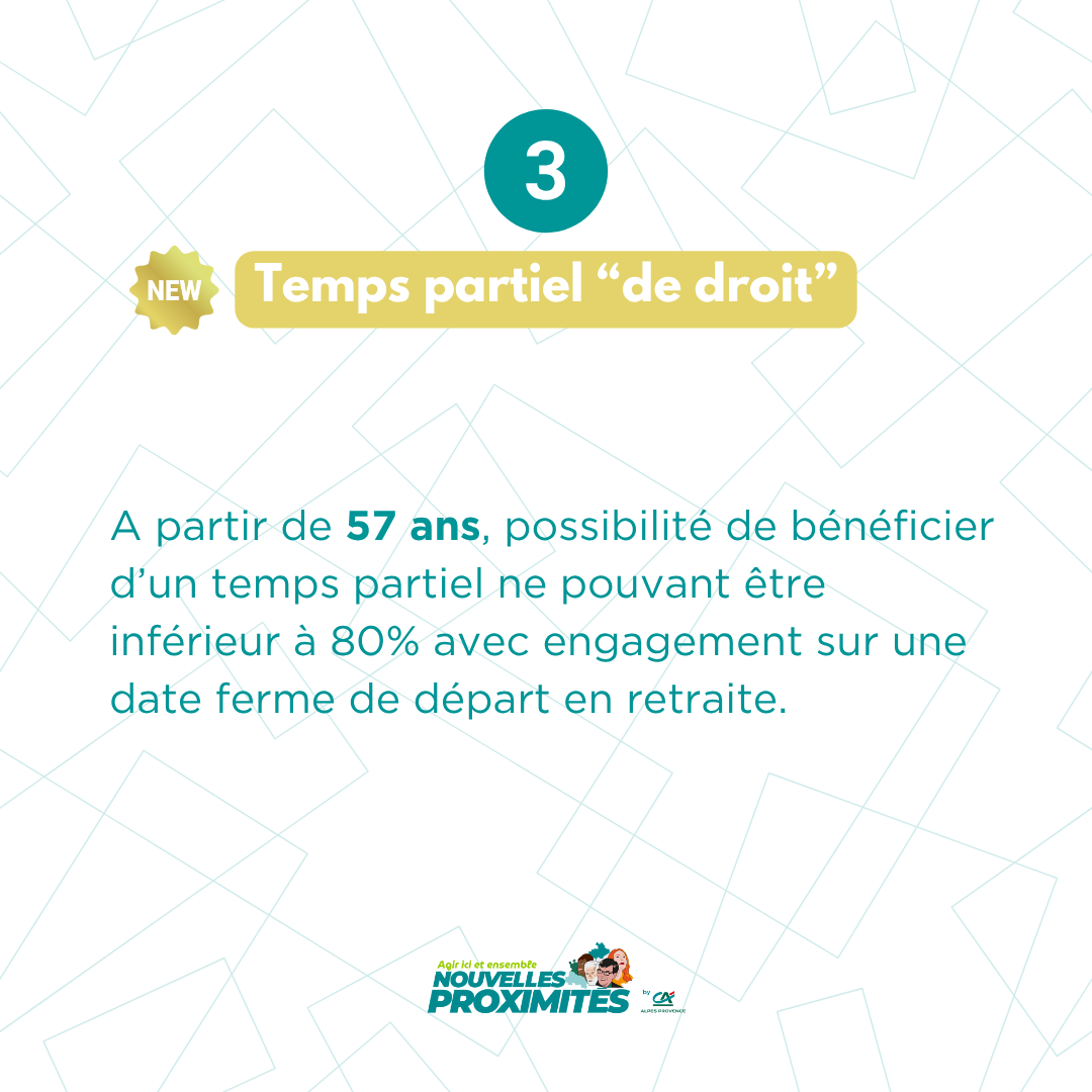→ Dès 57 ans, possibilité de bénéficier d’un temps partiel (minimum 80 %), avec un engagement sur une date de départ en retraite.